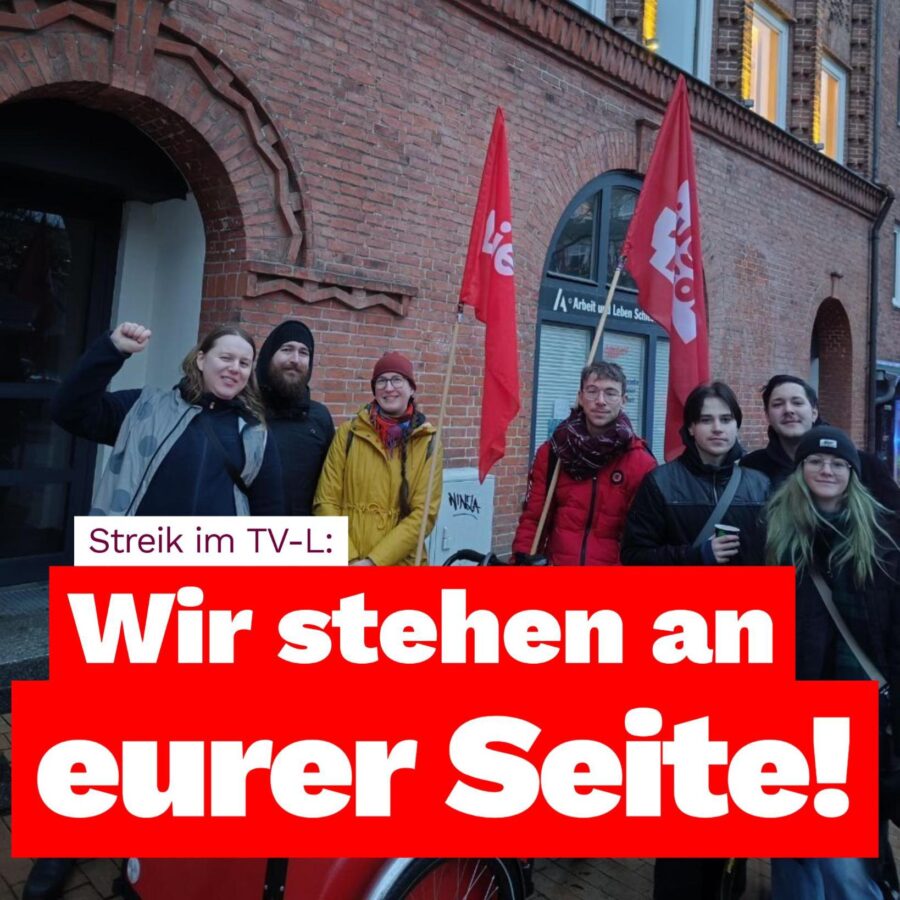 Streik im TV-L: Wir stehen an eurer Seite! Als Hintergrund ein Bild von Genoss*innen bei der Streik-Soli vor dem Kieler Gewerkschaftshaus